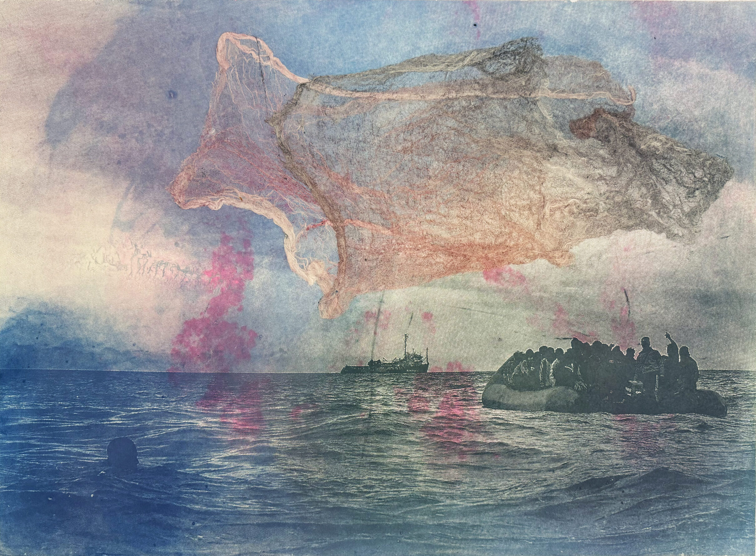 The three artists presented, Cansu Korkmaz, Nazanin Noroozi, and Bart Was Not Here, all approach their practice with the history and nuance of lived experiences expressed through painting, collage, textures, and personal imagery. There is a bipartite dialogue between intimacy and transition, pain and calm, as works engage with both world-building and destruction. The works presented for Encapsulate In Transcendence condense emotions and actions across all directions, serving as an impetus to strive and maintain momentum, regardless of the condition the mind and body find themselves in. These experiences stem from instability, longing, and in-between conditions dictated by migration and geopolitical circumstances.